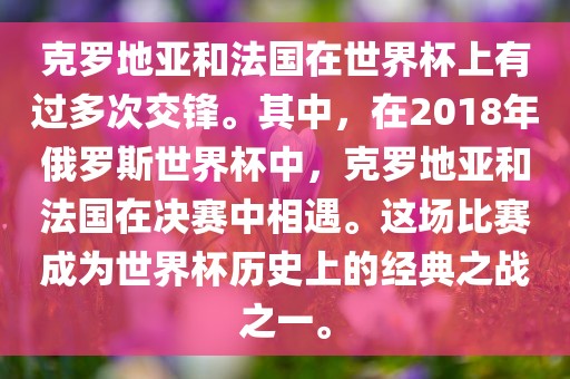 克罗地亚和法国在世界杯上有过多次交锋。其中,在2018年俄罗斯世界杯中,克罗地亚和法国在决赛中相遇。这场比赛成为世界杯历史上的经典之战之一。