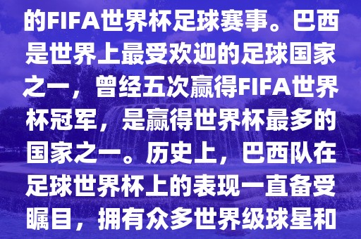 巴西足球世界杯是巴西举办的FIFA世界杯足球赛事,巴西是足球强国,曾五次夺得FIFA世界杯冠军。历史上,巴西队在足球世界杯上的表现备受瞩目,拥有众多世界级球星和经典比赛瞬间。此次赛事将呈现精彩纷呈的足球盛宴,吸引全球球迷的关注。