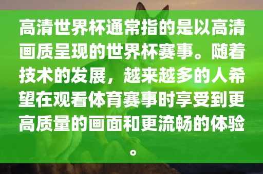 高清世界杯通常指的是以高清画质呈现的世界杯赛事。随着技术的发展,越来越多的人希望在观看体育赛事时享受到更高质量的画面和更流畅的体验。