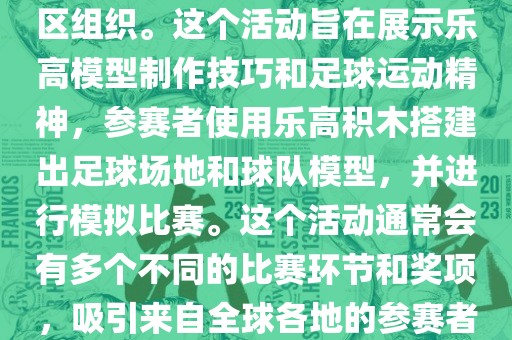 具体的活动安排和规则可能会因组织者和年份而异,建议关注相关社区或官方渠道以获取最新信息,乐高公司本身也可能推出与足球或世界杯相关的乐高套装或模型,供爱好者们收藏和展示。