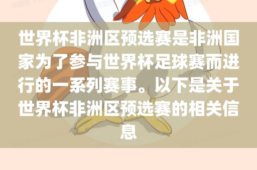 世界杯非洲区预选赛是非洲国家为了参与世界杯足球赛而展开的重要赛事,各队之间的竞争非常激烈,具体的比赛安排、参与队伍和规则流程可能会根据当年的FIFA规定而有所变化,建议关注相关赛事的官方信息以获取最新动态。