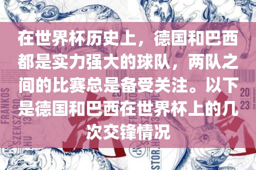 在世界杯历史上,德国和巴西都是实力强大的球队,两队之间的比赛总是备受关注。以下是德国和巴西在世界杯上的几次交锋情况