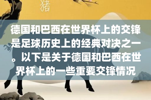 德国和巴西在世界杯上的交锋是足球历史上的经典对决之一。以下是关于德国和巴西在世界杯上的一些重要交锋情况