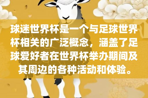 球迷世界杯是一个与足球世界杯相关的广泛概念,涵盖了足球爱好者在世界杯举办期间及其周边的各种活动和体验。