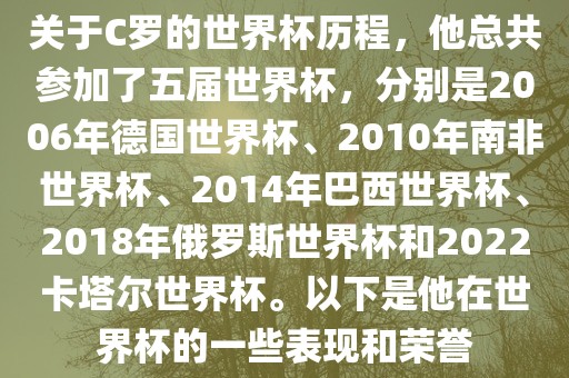 关于C罗的世界杯历程,他总共参加了五届世界杯,分别是2006年德国世界杯、2010年南非世界杯、2014年巴西世界杯、2018年俄罗斯世界杯和2022卡塔尔世界杯。以下是他在世界杯的一些表现和荣誉