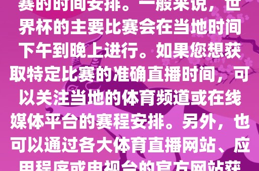由于时差和版权问题,不是所有比赛都能在所有地区进行直播,建议您关注官方渠道或可靠的新闻来源以获取最新的世界杯直播时间信息。
