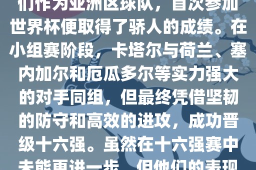 关于卡塔尔在2022年世界杯的表现,可以说是非常出色的。他们作为亚洲区球队,首次参加世界杯便取得了骄人的成绩。在小组赛阶段,卡塔尔与荷兰、塞内加尔和厄瓜多尔等实力强大的对手同组,但最终凭借坚韧的防守和高效的进攻,成功晋级十六强。虽然在十六强赛中未能更进一步,但他们的表现已经赢得了球迷和对手的尊重。