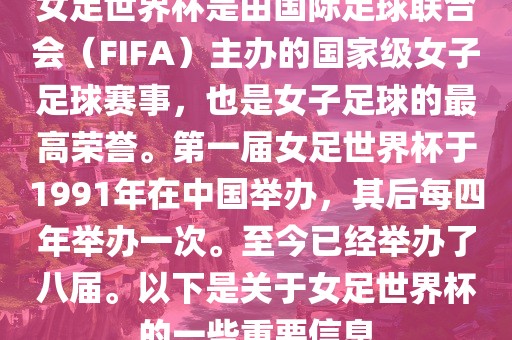 女足世界杯是由国际足球联合会(FIFA)主办的国家级女子足球赛事,也是女子足球的最高荣誉。第一届女足世界杯于1991年在中国举办,其后每四年举办一次。至今已经举办了八届。以下是关于女足世界杯的一些重要信息