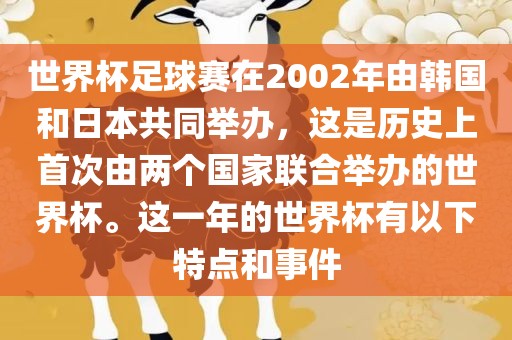 世界杯足球赛在2002年由韩国和日本共同举办,这是历史上首次由两个国家联合举办的世界杯。这一年的世界杯有以下特点和事件