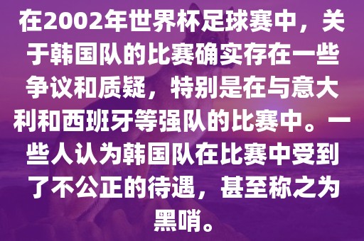 在2002年世界杯足球赛中,关于韩国队的比赛确实存在一些争议和质疑,特别是在与意大利和西班牙等强队的比赛中。一些人认为韩国队在比赛中受到了不公正的待遇,甚至称之为黑哨。
