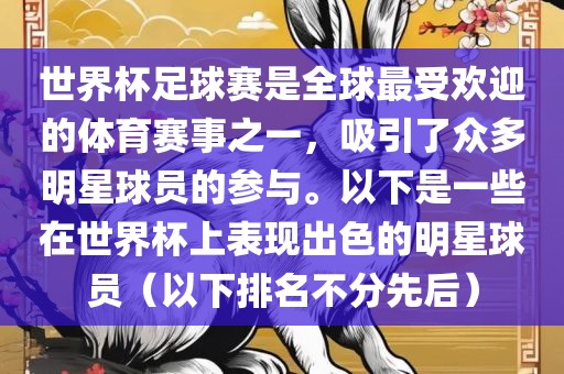 世界杯足球赛是全球最受欢迎的体育赛事之一,吸引了众多明星球员的参与。以下是一些在世界杯上表现出色的明星球员(以下排名不分先后)