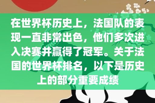 在世界杯历史上,法国队的表现一直非常出色,他们多次进入决赛并赢得了冠军。关于法国的世界杯排名,以下是历史上的部分重要成绩