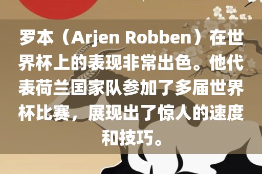 罗本在世界杯上的最佳表现之一是在2010年南非世界杯上,他作为荷兰国家队的核心球员之一,帮助球队在比赛中取得了出色的成绩,在那届比赛中,罗本以其惊人的速度和突破能力成为了球队进攻端的重要武器,并在多场比赛中为球队创造了很多进球机会。